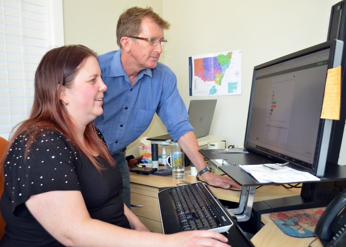 Regional Development Australia Northern Inland Finance and Project Officer Rebecca Wright and Senior Research Economist David Thompson monitor the non-farm business drought survey results.