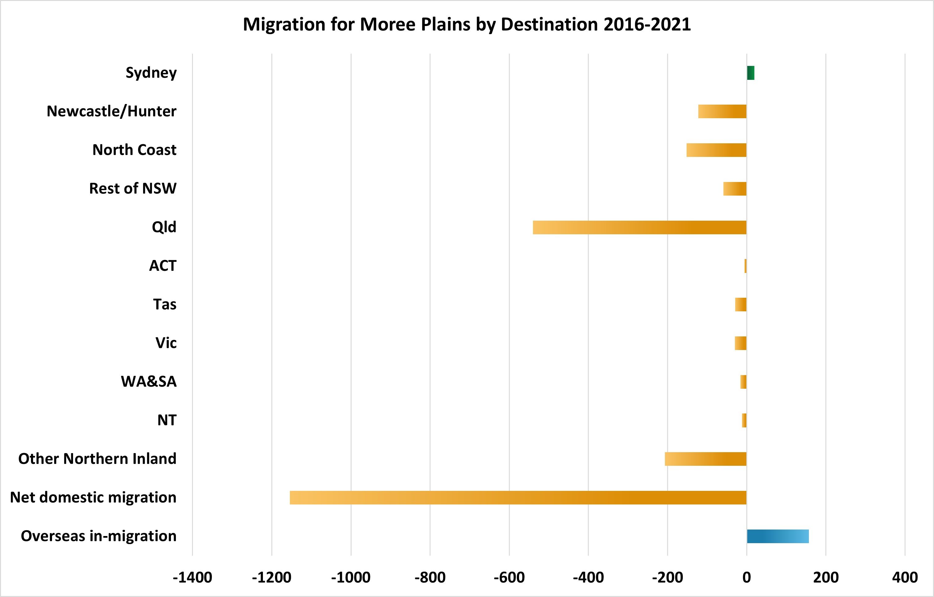 The Moree Plains saw a substantial net loss of 1,154 people in terms of domestic migration mostly to Qld, North Coast of NSW, other Northern Inland LGAs and the Newcastle/Hunter region. Only Sydney produced a net inflow of people to the LGA. 157 people moved to the region from overseas.