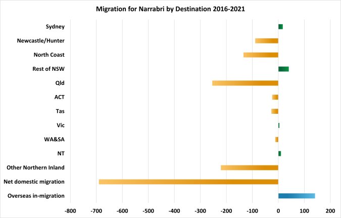 Narrabri Shire had a net loss of 690 people in terms of domestic migration mostly to Qld, other Northern Inland LGAs, the North Coast of NSW and the Newcastle/Hunter region. Sydney and the rest of NSW produced net inflows of people to the LGA. 141 people moved to the region from overseas.