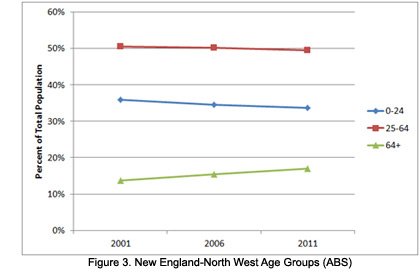Census time-series data (Figure 3) demonstrates the ageing of our population, with a significant increase in the percentage of people in the 64+ years age categories. It also reveals a decline in the proportion of young people (ages 0-24) and a slight downward trend in the important working age group of people aged 25-64.