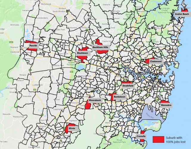 “To bring the picture into focus for those in the city, we were able to map the equivalent economic downturn, if it was to occur in Sydney. 4,178 jobs lost in our region is 5.8% of the workforce. The equivalent impact in Sydney would be 130,000 job losses, or 100% of jobs lost in each of the 11 suburbs shown in red on the map, namely Avalon Beach, Bankstown, Baulkham Hills, Blacktown, Chatswood, Cronulla, Maroubra, Minto, Moorebank, Penrith and Strathfield,” Mr. Thompson said.