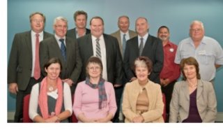 The members include: Mal Peters, Inverell, NSW; Geoff Wise, Bourke, NSW; Ian Todd, St George Qld; Katrina Humphries, Moree, NSW; Ed Fessey, Brewarrina, NSW; Fred Hooper, Weilmoringle, NSW; Donna Stewart, St George, Qld; Michelle Ramsay, Bonshaw, NSW; Sarah Moles, Goomburra, Qld; Bruce McCollum, Goondiwindi, Qld; John Clements, Wee Waa, NSW. The committee is pictured with Craig Knowles (Chair, MDBA) and Rhondda Dickson (CEO, MDBA).