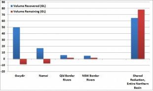 The bars on the right of the chart show the situation for downstream environmental water requirements for the entire Northern Basin (i.e. the Barwon-Darling Watercourse, Condamine-Balonne, Gwydir, Interesecting Streams, Macquarie-Castlereagh, Moonie, Namoi, Paroo, Warrego and Border Rivers).  143 GL were required from these catchments to provide additional flows downstream in the Barwon-Darling system.  65 GL have been recovered, leaving 78 GL still to be recovered.